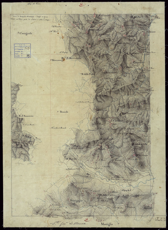 "Gruppo di diciannove minute di campagna eseguite alla scala di 1:20.000 nel 1826 firmate dal Ten. La Marmora, Conte Thaon di Revel, Capitani Mariani e Muletti. Tenenti Lagrange e Solaro. Si riferiscano alla valle del Po tra Chivasso e Casale. Rappresentano l'orografia a curve dimostrative e sfumo, abitati in rosso, acque in azzurro. Fogli montati su tela di dimensioni varie."