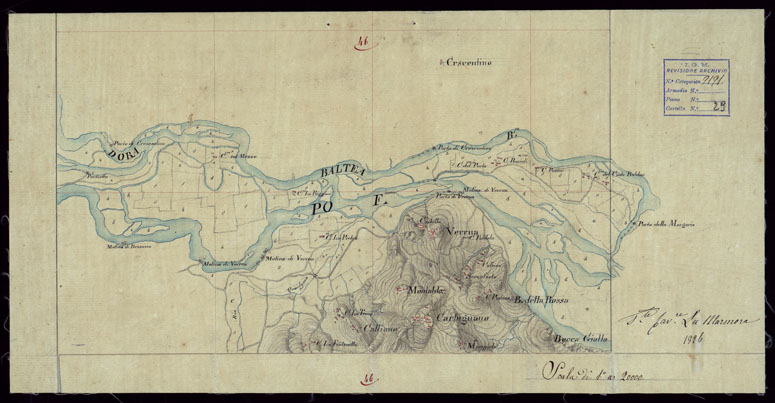 "Gruppo di diciannove minute di campagna eseguite alla scala di 1:20.000 nel 1826 firmate dal Ten. La Marmora, Conte Thaon di Revel, Capitani Mariani e Muletti. Tenenti Lagrange e Solaro. Si riferiscano alla valle del Po tra Chivasso e Casale. Rappresentano l'orografia a curve dimostrative e sfumo, abitati in rosso, acque in azzurro. Fogli montati su tela di dimensioni varie."