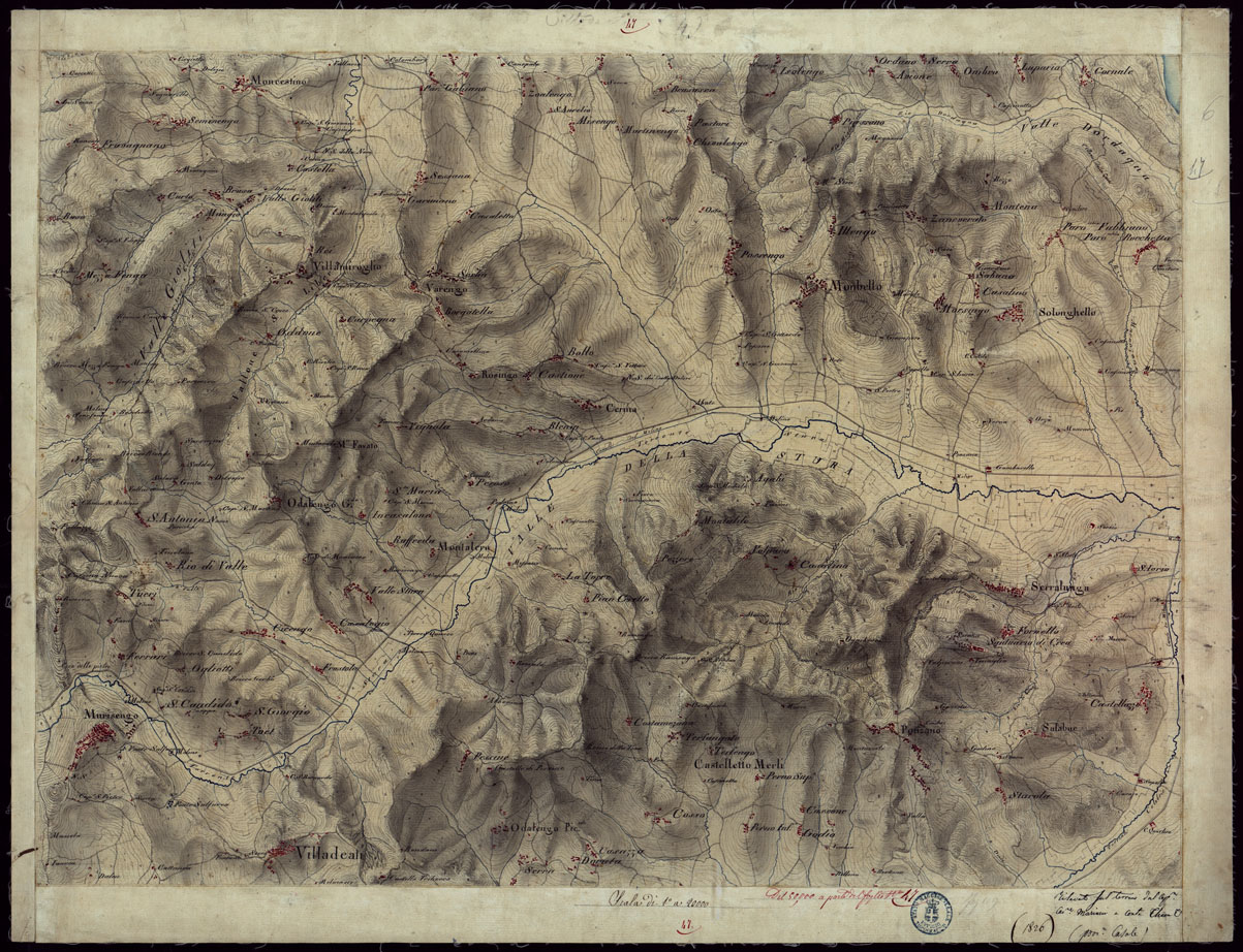 "Gruppo di diciannove minute di campagna eseguite alla scala di 1:20.000 nel 1826 firmate dal Ten. La Marmora, Conte Thaon di Revel, Capitani Mariani e Muletti. Tenenti Lagrange e Solaro. Si riferiscano alla valle del Po tra Chivasso e Casale. Rappresentano l'orografia a curve dimostrative e sfumo, abitati in rosso, acque in azzurro. Fogli montati su tela di dimensioni varie."