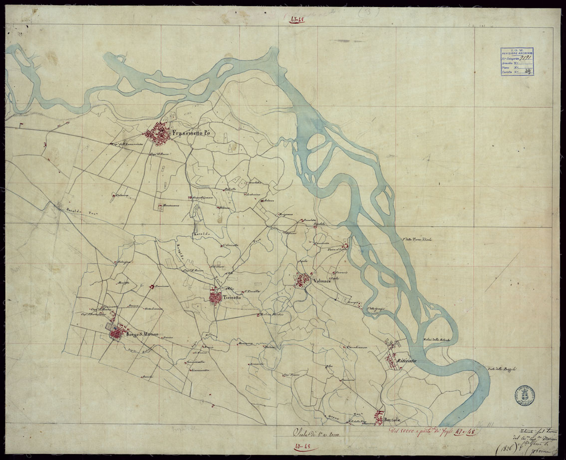 "Gruppo di diciannove minute di campagna eseguite alla scala di 1:20.000 nel 1826 firmate dal Ten. La Marmora, Conte Thaon di Revel, Capitani Mariani e Muletti. Tenenti Lagrange e Solaro. Si riferiscano alla valle del Po tra Chivasso e Casale. Rappresentano l'orografia a curve dimostrative e sfumo, abitati in rosso, acque in azzurro. Fogli montati su tela di dimensioni varie."