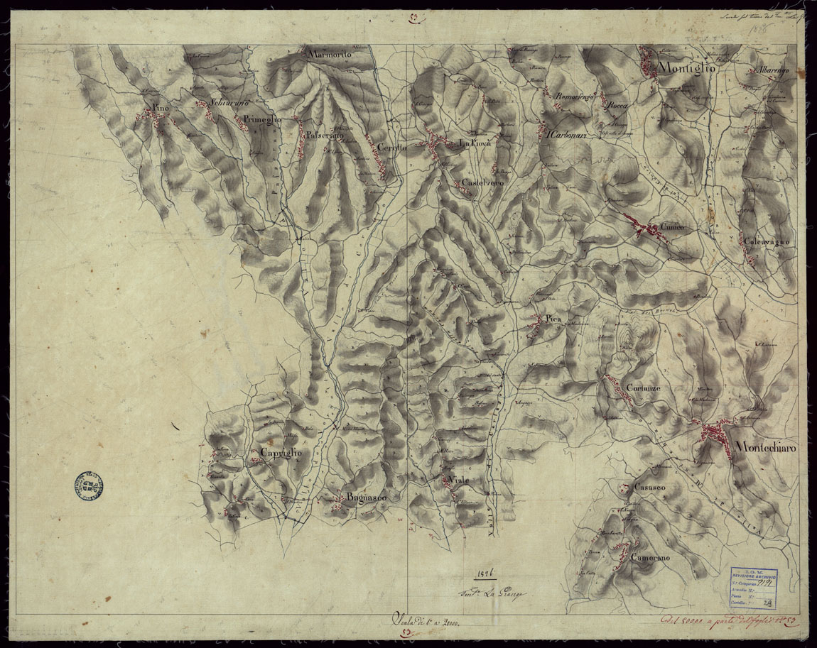 "Gruppo di diciannove minute di campagna eseguite alla scala di 1:20.000 nel 1826 firmate dal Ten. La Marmora, Conte Thaon di Revel, Capitani Mariani e Muletti. Tenenti Lagrange e Solaro. Si riferiscano alla valle del Po tra Chivasso e Casale. Rappresentano l'orografia a curve dimostrative e sfumo, abitati in rosso, acque in azzurro. Fogli montati su tela di dimensioni varie."