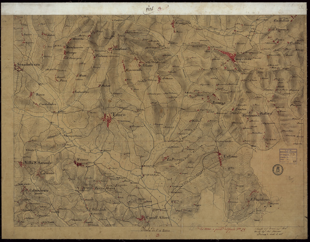 "Gruppo di diciannove minute di campagna eseguite alla scala di 1:20.000 nel 1826 firmate dal Ten. La Marmora, Conte Thaon di Revel, Capitani Mariani e Muletti. Tenenti Lagrange e Solaro. Si riferiscano alla valle del Po tra Chivasso e Casale. Rappresentano l'orografia a curve dimostrative e sfumo, abitati in rosso, acque in azzurro. Fogli montati su tela di dimensioni varie."