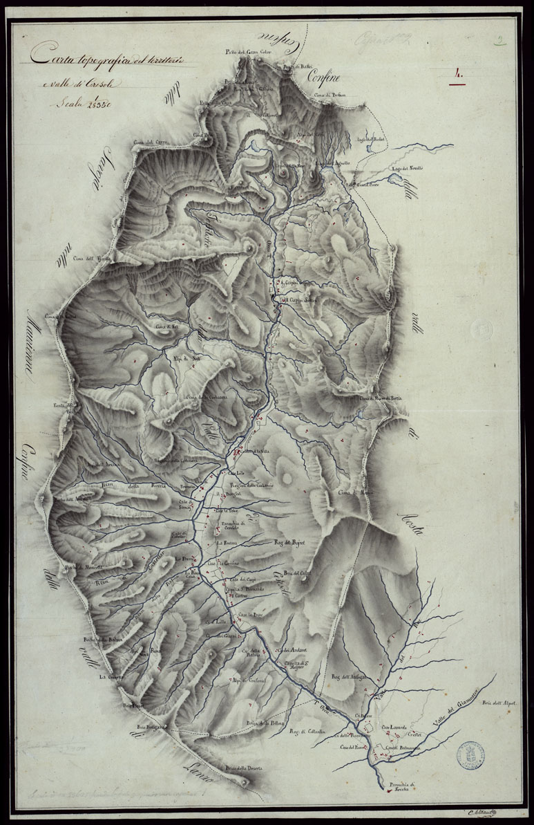 "Disegno acquerellato a luce obliqua, acque in azzurro, abitati in rosso, strade in giallo. Carte analoghe ai documenti n . 230 n.232 e n. 233."
