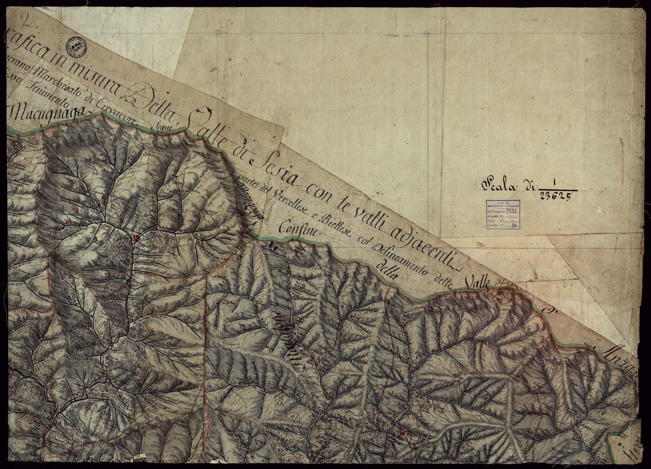 CARTA TOPOGRAFICA IN MISURA DELLA VALLE DI SESIA CON LE VALLI ADIACENTI AD ESSA PRINCIPATO MESSERANO MARCHESATO DI CRAVACORE E PARTE DEL VERCELLESE E BIELLESE COL DELINEAMENTO DELLE MINIERE ESISTENTI E IN TUTTO ESSO TENIMENTO. - PARTE 2.