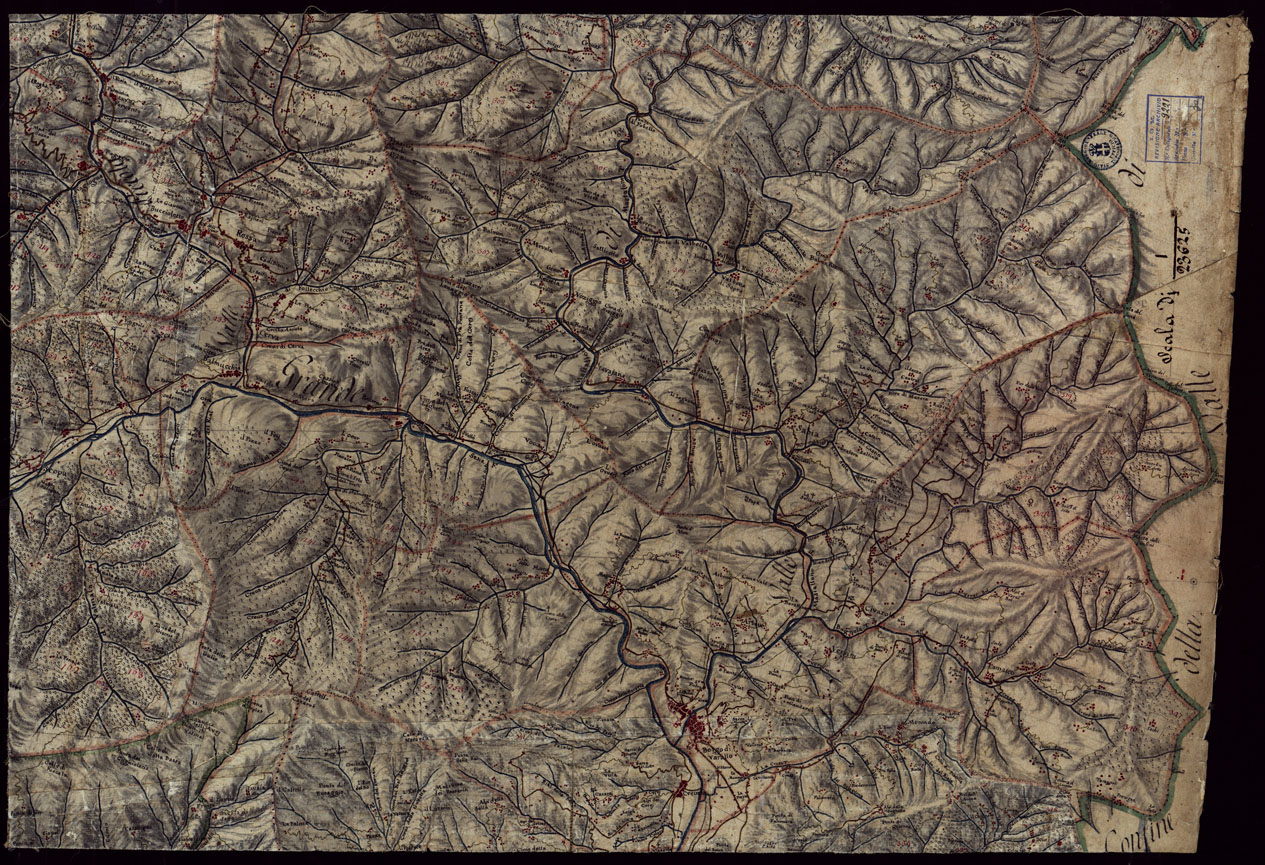 CARTA TOPOGRAFICA IN MISURA DELLA VALLE DI SESIA CON LE VALLI ADIACENTI AD ESSA PRINCIPATO MESSERANO MARCHESATO DI CRAVACORE E PARTE DEL VERCELLESE E BIELLESE COL DELINEAMENTO DELLE MINIERE ESISTENTI E IN TUTTO ESSO TENIMENTO. - PARTE 4.