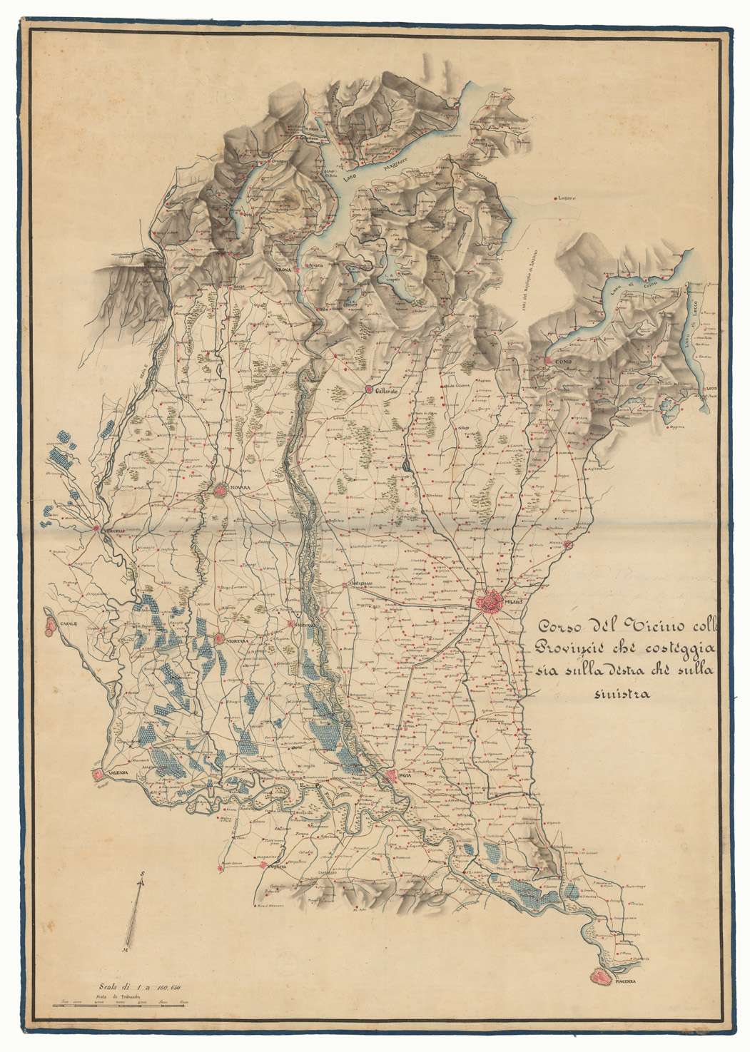 "Disegno ad acquerello montato su tela. Orografia a sfumo a luce obliqua. Abitati e strade in rosso, acque in azzurro, vegetazioni in verde. Scala grafica in trabucchi. Ai documenti n. 243 e n. 244 altri due esemplari con il titlo: "CARTA TOPOGRAFICA della Maggior parte della Divisione del Governo di NOVARA Con parte del Milanese"