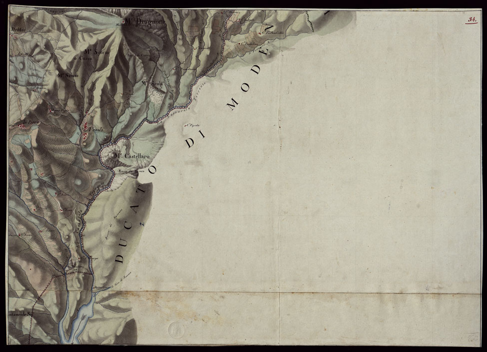 "Gruppo di 100 minute di campagna dei rilevamenti eseguiti negli anni 1816-27 dagli Ufficiali del Corpo di S. M. Capitani D'Isaia Albert e Salasco, Tenenti D'Angennes, Quaglia, Roberti e Scoti, i Sottotenenti Alberti, Bergalli, Mariani, Muletti e S. Marzano. Queste minute sono tutte disegnate artisticamente ad acquerello: rappresentano l'orografia con lo sfumo a luce obliqua, gli abitati in rosso, le acque in azzurro, vegetazioni e colture in verde, strade in nero."