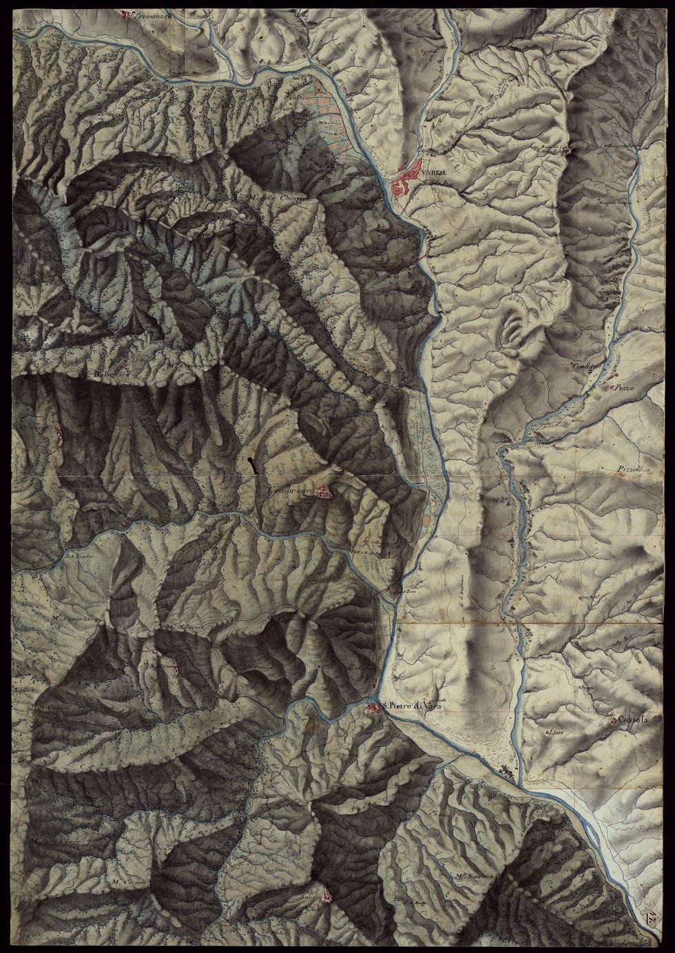 "Gruppo di 100 minute di campagna dei rilevamenti eseguiti negli anni 1816-27 dagli Ufficiali del Corpo di S. M. Capitani D'Isaia Albert e Salasco, Tenenti D'Angennes, Quaglia, Roberti e Scoti, i Sottotenenti Alberti, Bergalli, Mariani, Muletti e S. Marzano. Queste minute sono tutte disegnate artisticamente ad acquerello: rappresentano l'orografia con lo sfumo a luce obliqua, gli abitati in rosso, le acque in azzurro, vegetazioni e colture in verde, strade in nero."