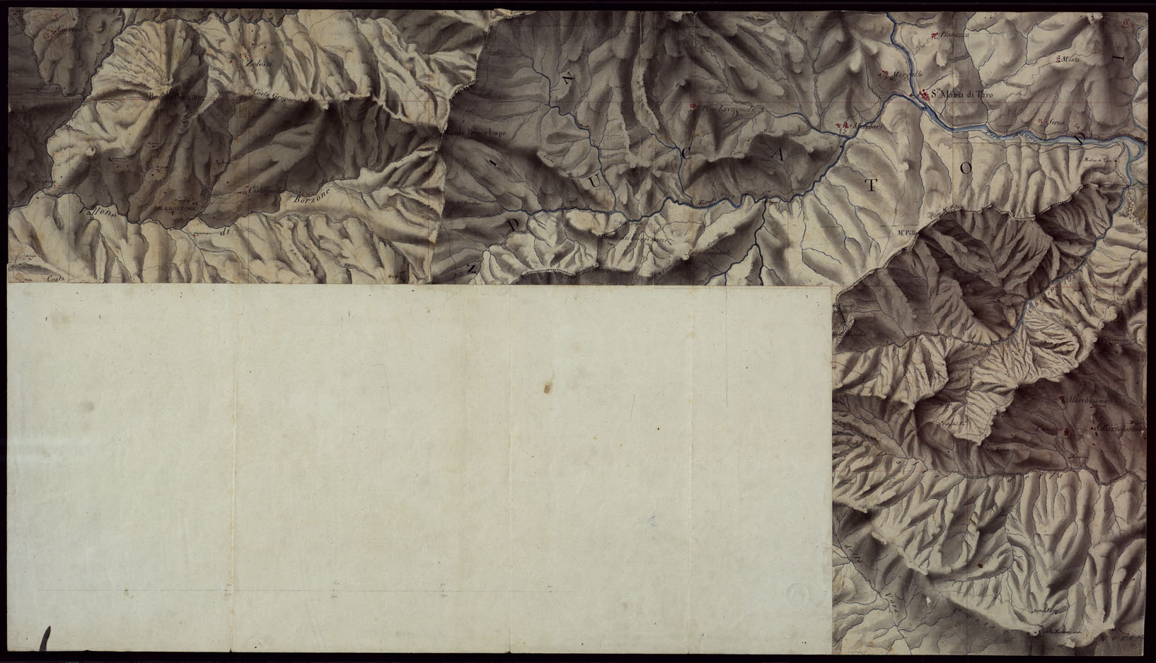 "Gruppo di 100 minute di campagna dei rilevamenti eseguiti negli anni 1816-27 dagli Ufficiali del Corpo di S. M. Capitani D'Isaia Albert e Salasco, Tenenti D'Angennes, Quaglia, Roberti e Scoti, i Sottotenenti Alberti, Bergalli, Mariani, Muletti e S. Marzano. Queste minute sono tutte disegnate artisticamente ad acquerello: rappresentano l'orografia con lo sfumo a luce obliqua, gli abitati in rosso, le acque in azzurro, vegetazioni e colture in verde, strade in nero."
