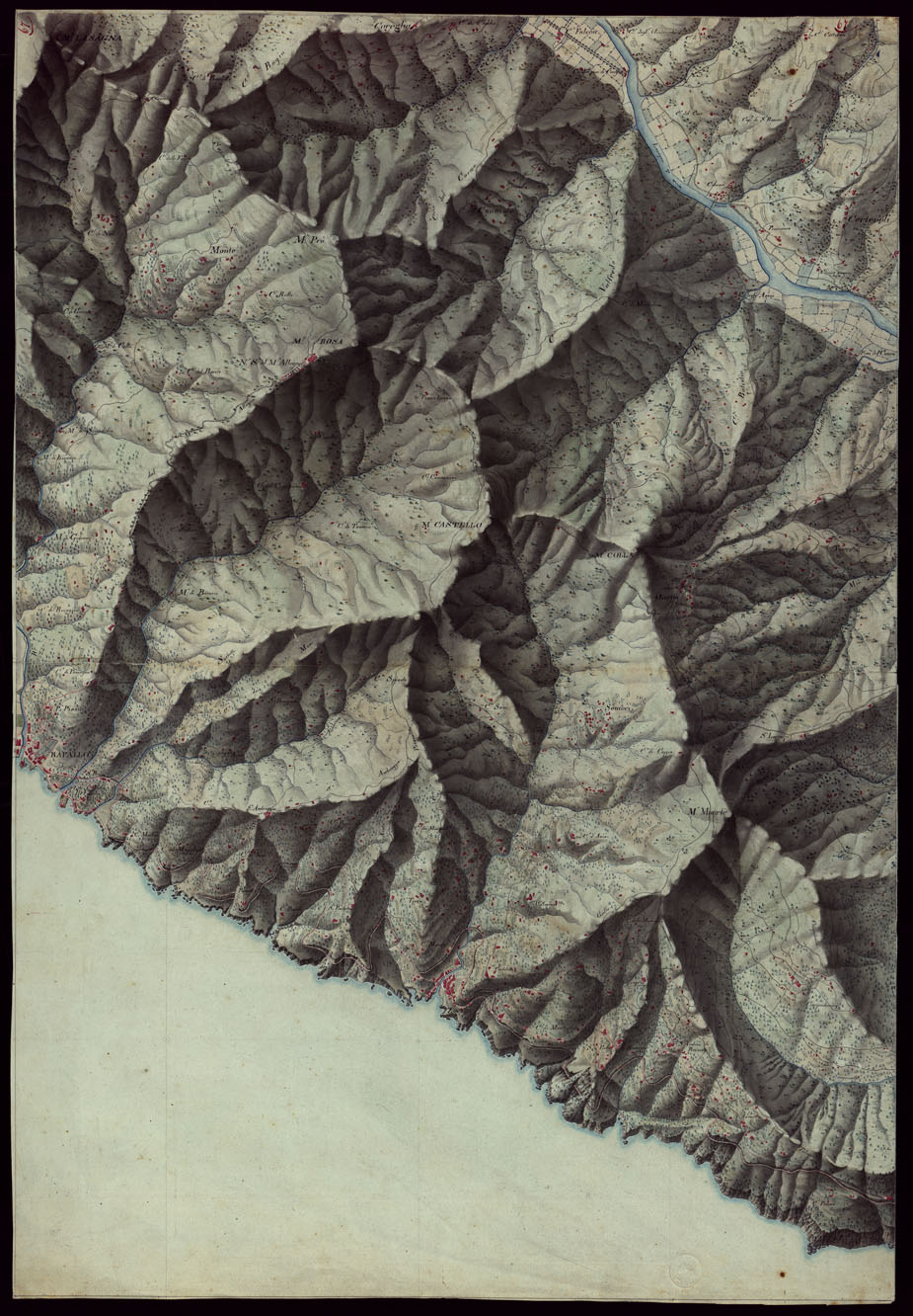 "Gruppo di 100 minute di campagna dei rilevamenti eseguiti negli anni 1816-27 dagli Ufficiali del Corpo di S. M. Capitani D'Isaia Albert e Salasco, Tenenti D'Angennes, Quaglia, Roberti e Scoti, i Sottotenenti Alberti, Bergalli, Mariani, Muletti e S. Marzano. Queste minute sono tutte disegnate artisticamente ad acquerello: rappresentano l'orografia con lo sfumo a luce obliqua, gli abitati in rosso, le acque in azzurro, vegetazioni e colture in verde, strade in nero."