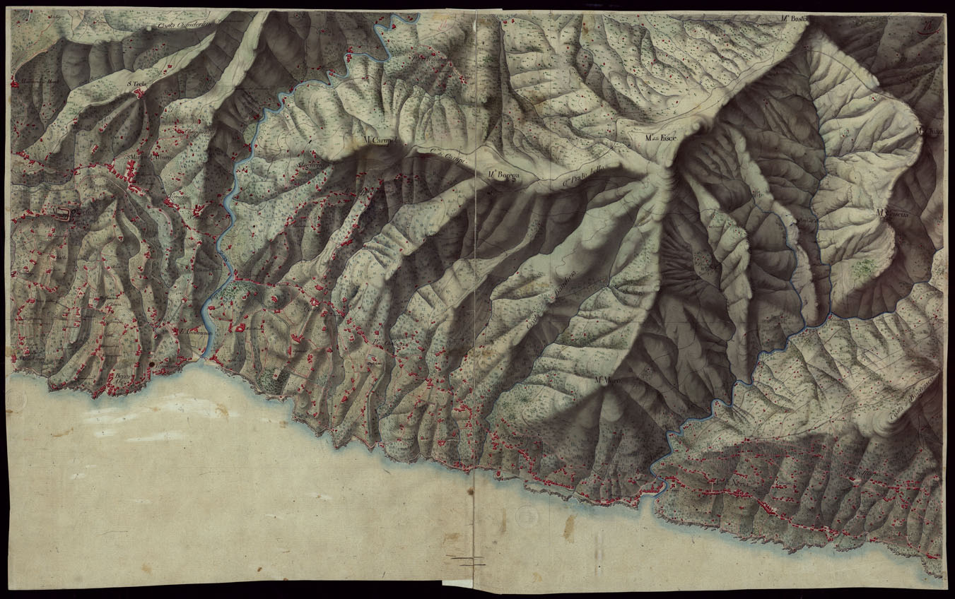 "Gruppo di 100 minute di campagna dei rilevamenti eseguiti negli anni 1816-27 dagli Ufficiali del Corpo di S. M. Capitani D'Isaia Albert e Salasco, Tenenti D'Angennes, Quaglia, Roberti e Scoti, i Sottotenenti Alberti, Bergalli, Mariani, Muletti e S. Marzano. Queste minute sono tutte disegnate artisticamente ad acquerello: rappresentano l'orografia con lo sfumo a luce obliqua, gli abitati in rosso, le acque in azzurro, vegetazioni e colture in verde, strade in nero."