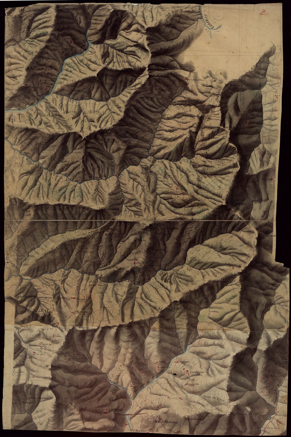 "Gruppo di 100 minute di campagna dei rilevamenti eseguiti negli anni 1816-27 dagli Ufficiali del Corpo di S. M. Capitani D'Isaia Albert e Salasco, Tenenti D'Angennes, Quaglia, Roberti e Scoti, i Sottotenenti Alberti, Bergalli, Mariani, Muletti e S. Marzano. Queste minute sono tutte disegnate artisticamente ad acquerello: rappresentano l'orografia con lo sfumo a luce obliqua, gli abitati in rosso, le acque in azzurro, vegetazioni e colture in verde, strade in nero."
