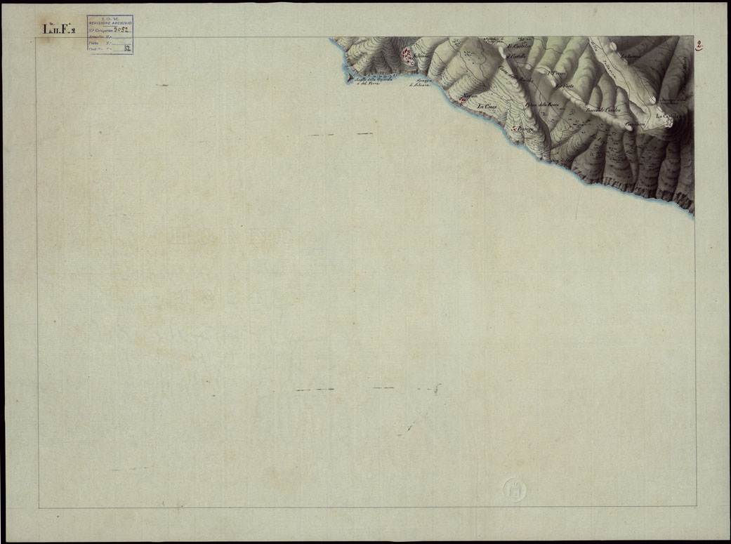 "Il documento è costituito da un gruppo di 23 bellissime tavolette copie "in netto" di alcune delle minute della "Riviera di Levante" (documento n. 251) eseguite con grande maestria ed accuratezza ad acquerello dagli ufficiali e topografi di S. M. Antonelli, Martini, Rinaudo, S. Marzano, Scoti. V'è annesso un foglio con la leggenda dei segni convenzionali. "