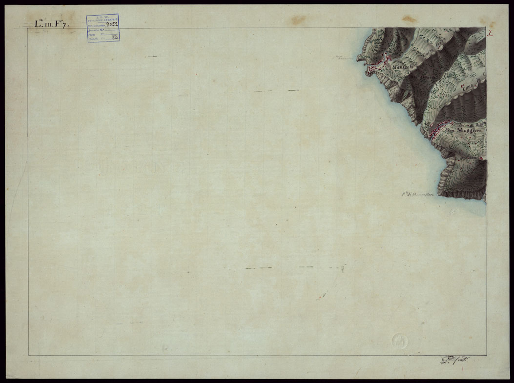 "Il documento è costituito da un gruppo di 23 bellissime tavolette copie "in netto" di alcune delle minute della "Riviera di Levante" (documento n. 251) eseguite con grande maestria ed accuratezza ad acquerello dagli ufficiali e topografi di S. M. Antonelli, Martini, Rinaudo, S. Marzano, Scoti. V'è annesso un foglio con la leggenda dei segni convenzionali. "