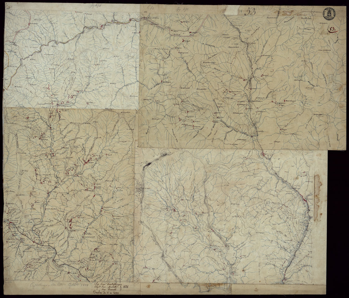 "Gruppo di 142 minute di campagna, e un quadro d'unione, in fogli irregolari, alcuni con degli spezzoni allegati, montati su tela. L'orografia vi è rappresentata variamente talvolta con curve dimostrative e tratteggio, oppure con sfumo a luce obliqua e tratteggio o con sfumo e curve dimostrative. Gli abitati sono colorati in rosso le acque in azzurro. Le minute sono firmate dagli Ufficiali del Corpo di Stato Maggiore: Albet, Bergalli, Casalegno, Castelborgo, Castellengo, Cossato, Gianotti, Mariani, Morozzo, Muletti, Pellegrini, D'Angennes, La Grange, La Marmora, Roberti, Scoti, che eseguirono le ricognizioni negli anni 1827-29."