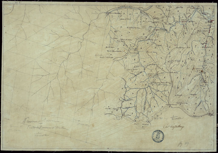 "Il titolo non è presente sulla carta. Quattro minute di campagna, delle ricognizioni eseguite nel 1827 dal Cap. Cav. Castellengo nel territorio della Provincia di Savona. Quattro fogli montati su tela."