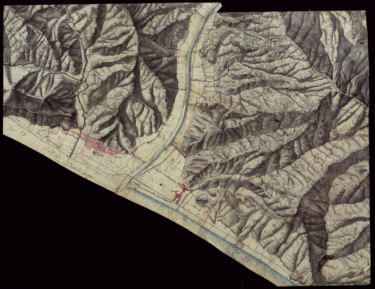 "Il titolo non è presente sulla carta. Quattro fogli irregolari formati da spezzoni uniti a mosaico, acquerellati a luce obliqua con abitati colorati in rosso ed acque in azzurro. "