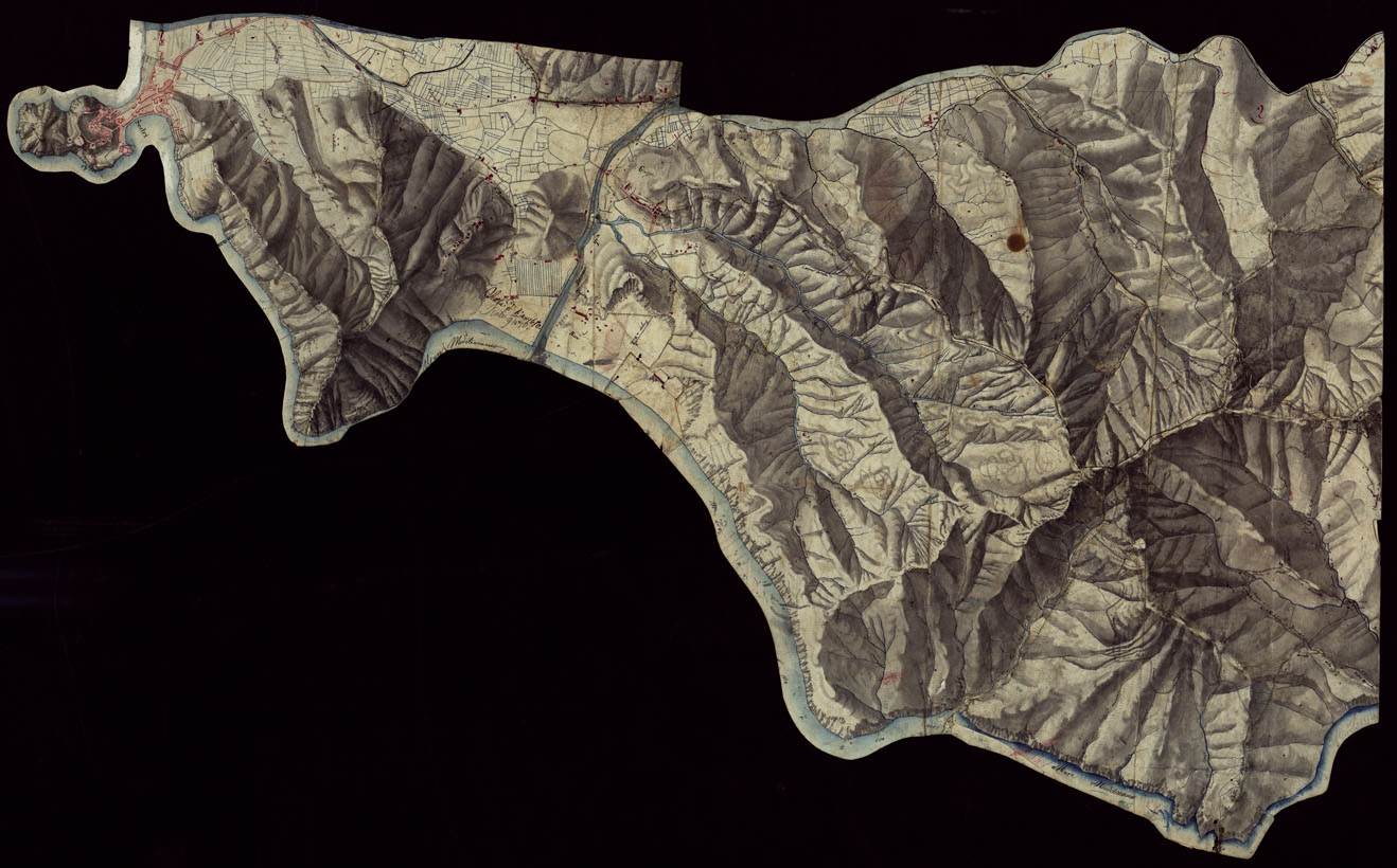 "Il titolo non è presente sulla carta. Quattro fogli irregolari formati da spezzoni uniti a mosaico, acquerellati a luce obliqua con abitati colorati in rosso ed acque in azzurro. "