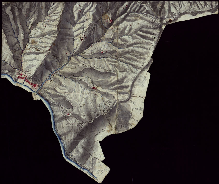 "Il titolo non è presente sulla carta. Quattro fogli irregolari formati da spezzoni uniti a mosaico, acquerellati a luce obliqua con abitati colorati in rosso ed acque in azzurro. "