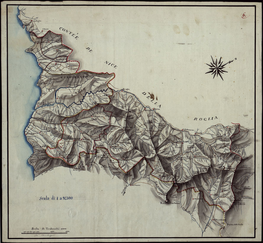 "Il titolo non è presente sulla carta. Disegno acquerellato a luce obliqua. E' orientato col nord volto verso il lato destro del foglio. Scala grafica in trabucchi. Senza data."