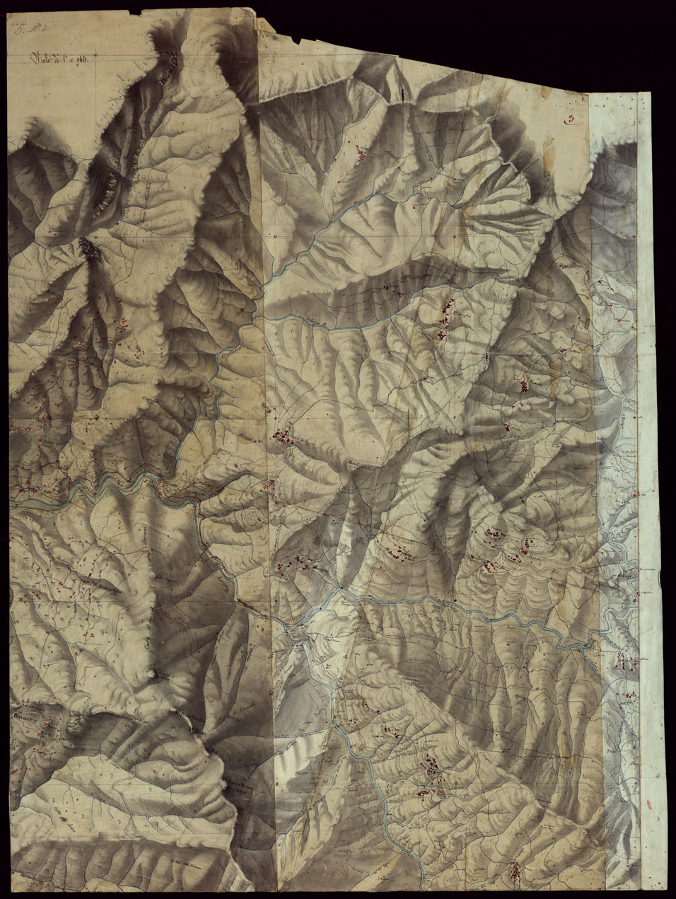 "Cinque fogli disegnati ad acquerello a luce obliqua, uniti a mosaico, senza data nè firma. Nel documento sono presenti due fogli diversi ma entrambi segnati come n. 4. Si presume che fossero vecchi rilievi utilizzati forse per la carta del Piemonte al 50. 000."