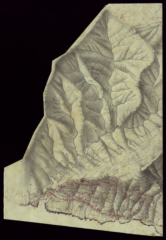 "Il titolo non è presente sulla carta. Cinque fogli disegnati ad acquerello a luce obliqua, uniti a mosaico, senza data nè firma. Nel documento sono presenti due fogli diversi ma entrambi segnati come n. 4. Si presume che fossero vecchi rilievi utilizzati forse per la carta del Piemonte al 50. 000."