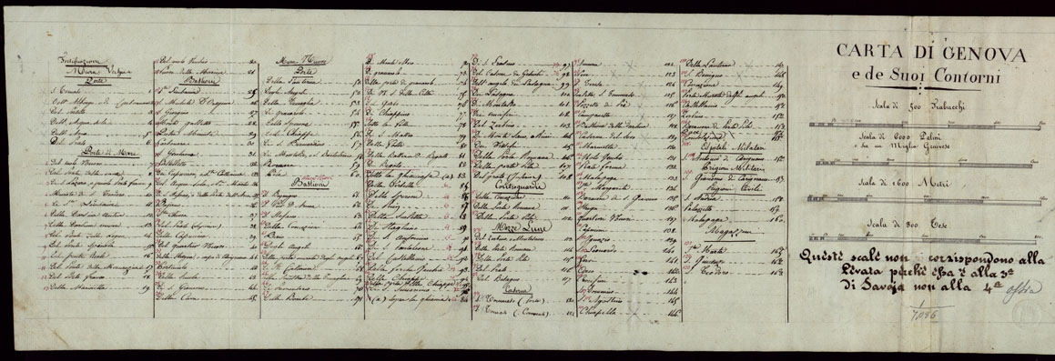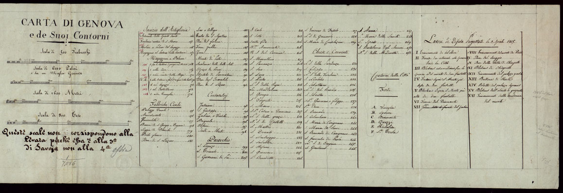"Carta in 12 fogli con Indice e Quadro d'unione. Minute di rilevamenti eseguite dagli Ingegneri topografi, sotto gli ordini del Conte di Saluzzo Magg. di Stato Maggiore Generale come da nota firmata dall'Ing. Topografo Pellegrini. Orografia a sfumo a luce obliqua, acque in azzurro, abitati in rosso. Sono indicate le colture. Strade in nero. Annesso un foglio col titolo, le scale grafiche ed elenco numerico delle costruzioni principali di Genova. A questa carta si riallaccia anche il documento n. 267/9382."