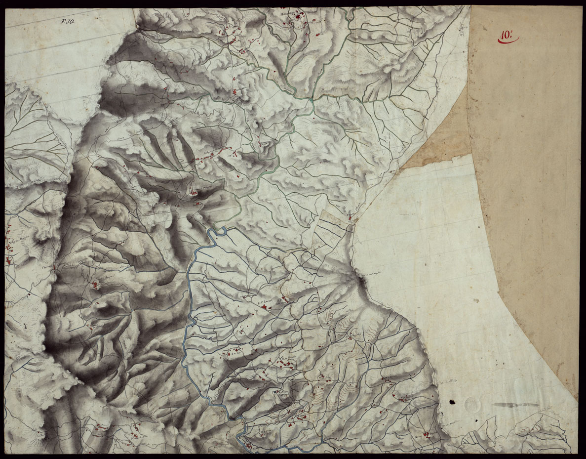 "Carta in 12 fogli con Indice e Quadro d'unione. Minute di rilevamenti eseguite dagli Ingegneri topografi, sotto gli ordini del Conte di Saluzzo Magg. di Stato Maggiore Generale come da nota firmata dall'Ing. Topografo Pellegrini. Orografia a sfumo a luce obliqua, acque in azzurro, abitati in rosso. Sono indicate le colture. Strade in nero. Annesso un foglio col titolo, le scale grafiche ed elenco numerico delle costruzioni principali di Genova. A questa carta si riallaccia anche il documento n. 267/9382."