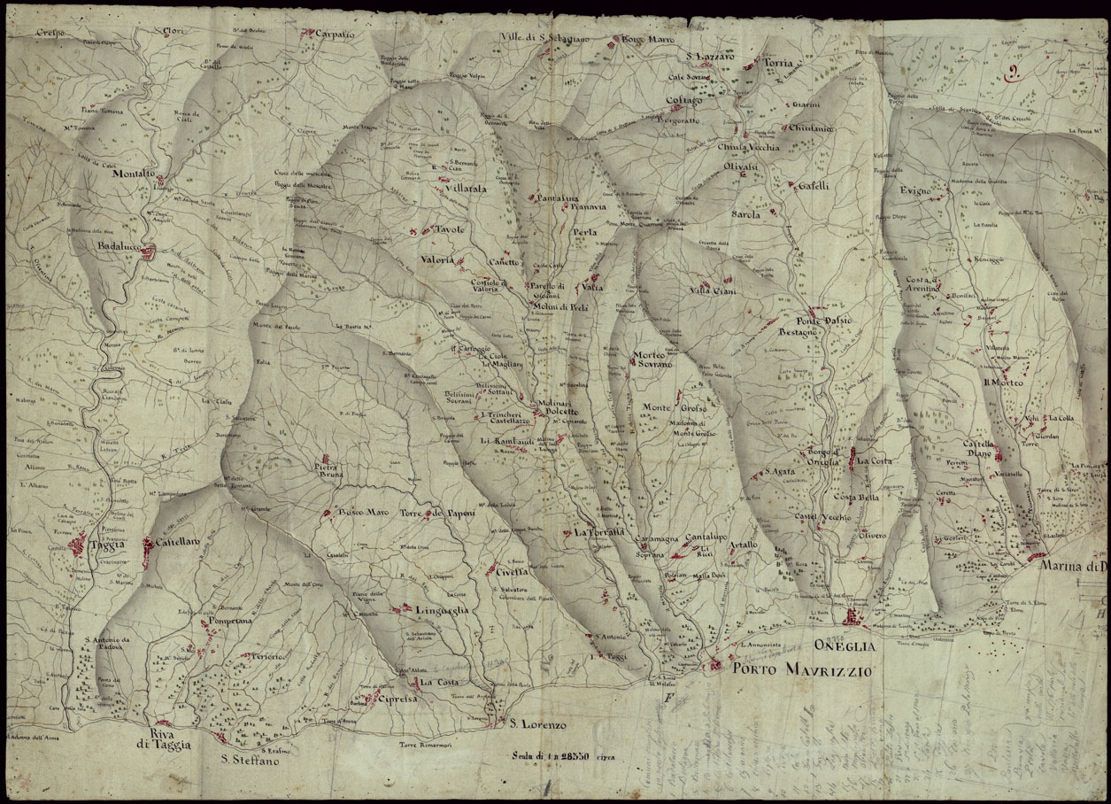 "Il titolo non è presente sulla carta. Disegno ad acquerello senza titolo e data. Abbozzo incompleto nella orografia dimostrata con lo sfumo a luce obliqua, acque in nero, abitati in rosso, vegetazione in verde. Epoca presunta principio XIX secolo."