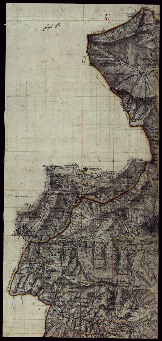 "Carta in dieci fogli senza data nè firma. Disegno con orografia rappresentata col tratteggio a luce obliqua, abitati e vegetazioni in nero, acque in azzurro, strade in rosso e giallo. Il foglio n° 2 contiene un quadro d'unione. "
