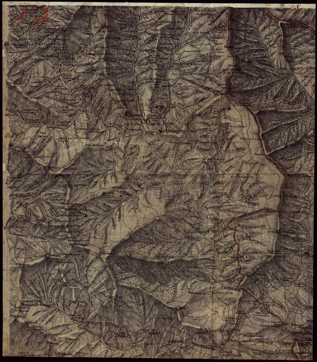 "Carta in dieci fogli senza data nè firma. Disegno con orografia rappresentata col tratteggio a luce obliqua, abitati e vegetazioni in nero, acque in azzurro, strade in rosso e giallo. Il foglio n° 2 contiene un quadro d'unione. "