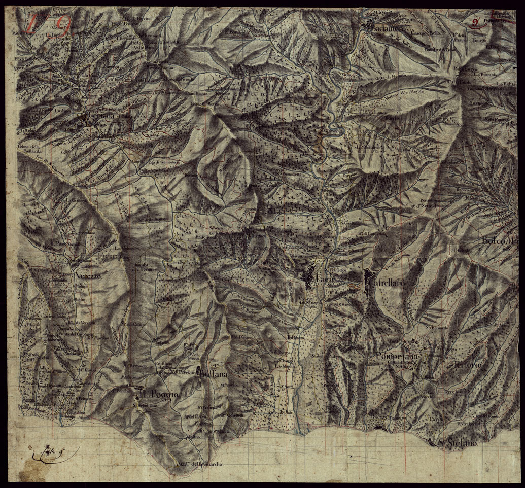 "Carta in dieci fogli senza data nè firma. Disegno con orografia rappresentata col tratteggio a luce obliqua, abitati e vegetazioni in nero, acque in azzurro, strade in rosso e giallo. Il foglio n° 2 contiene un quadro d'unione."