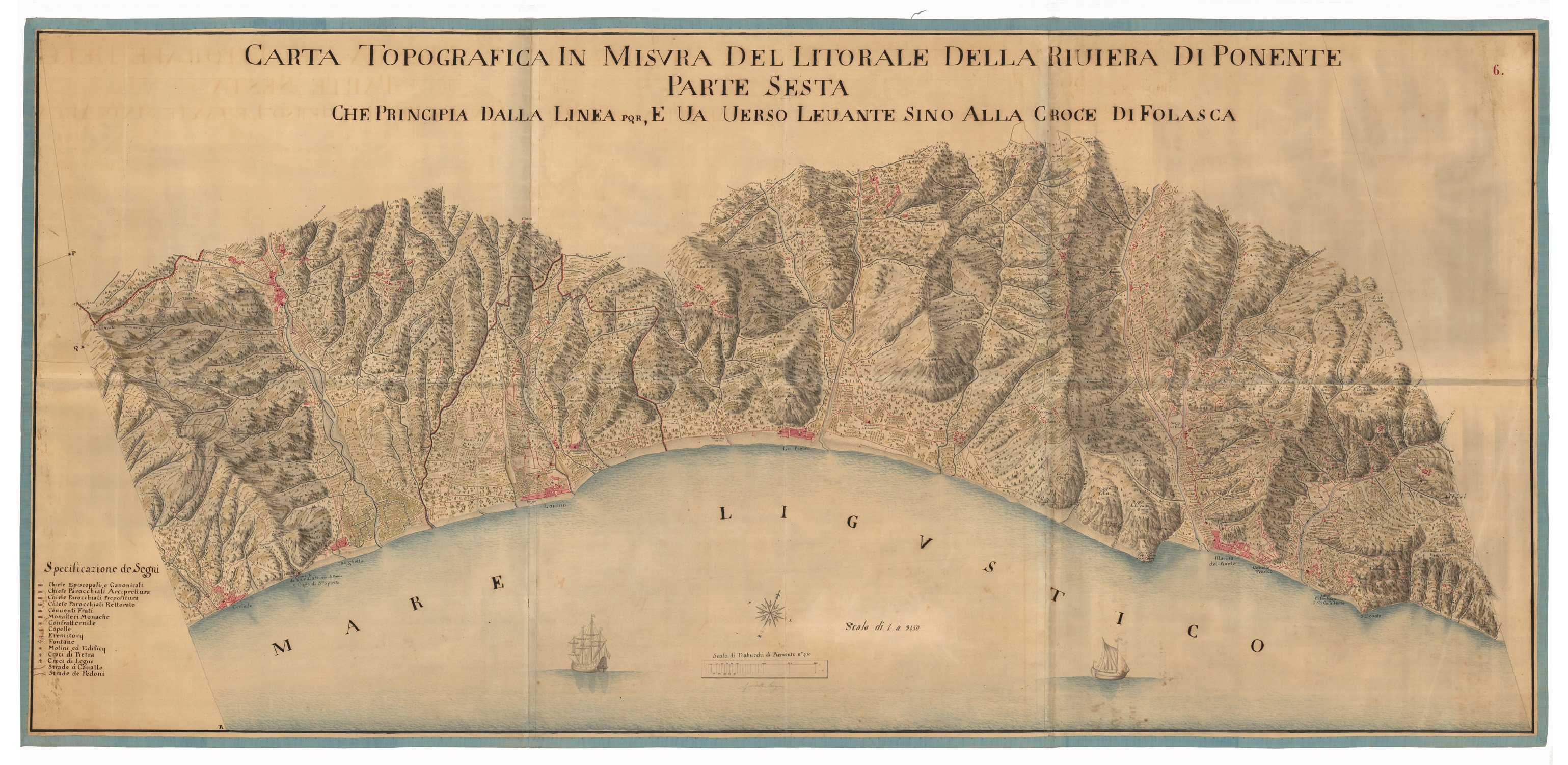 CARTA TOPOGRAFICA IN MISURA DEL LITORALE DELLA RIVERA DI PONENTE PARTE SESTA CHE PRINCIPIA DALLA LINEA PQR, E VA VERSO LEVANTE SINO ALLA CROCE DI FOLASCA RIVIERA DI PONENTE - FOGLIO 6 SEGNI CONVENZIONALI.