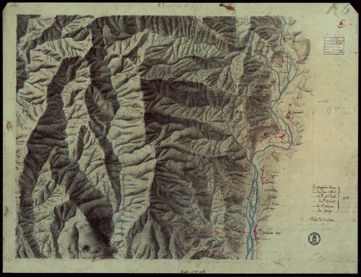 "Pregevole disegno ad acquerello in dodici fogli + quadro d'unione con orografia a sfumo a luce obliqua, acque in azzurro, abitati in rosso, colture e vegetazioni in verde, strade in nero. Rilievi originali degli Ufficiali Riccio, Albert, Scotti, Roberti, S. Marzano e Morozzo."