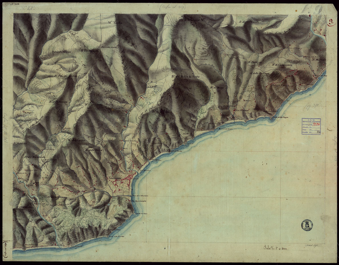 "Il titolo non è presente sulla carta. Pregevole disegno ad acquerello in dodici fogli + quadro d'unione con orografia a sfumo a luce obliqua, acque in azzurro, abitati in rosso, colture e vegetazioni in verde, strade in nero. Rilievi originali degli Ufficiali Riccio, Albert, Scotti, Roberti, S. Marzano e Morozzo."