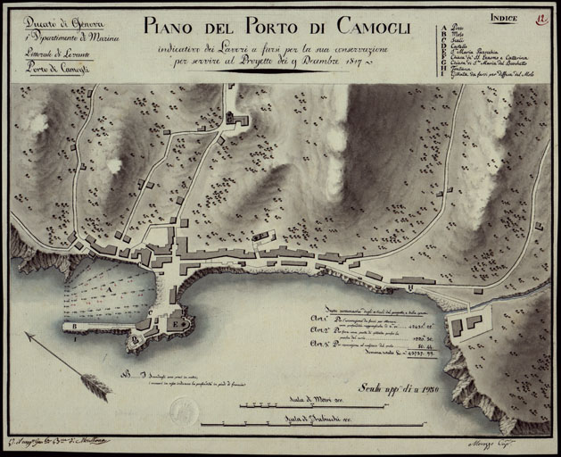 PIANO DEL PORTO DI CAMOGLI INDICATIVO DEI LAVORI A FARSI PER LA SUA CONSERVAZIONE E PER SERVIRE AL PROGETTO DEI 9 DICEMBRE 1817 - DUCATO DI GENOVA 1° DIPARTIMENTO DELLA MARINA LITTORALE DI LEVANTE PORTO DI CAMOGLI.