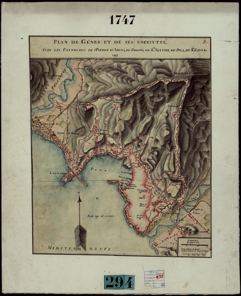 PLAN DE GENES ET DE SES ENCEINTES AVEC LE FAUBOURGS DE S. PIERRE D'ARENA, DE BISAGNO, DE S. AGATHE, DE PILA, DE S. ZIRO, ecc., 1747.