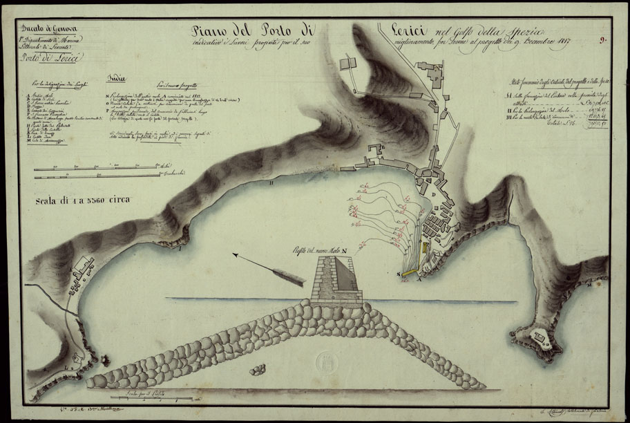 PIANO DEL PORTO DI LERICI NEL GOLFO DELLA SPEZIA INDICATIVO I LAVORI PROPOSTI PER IL SUO MIGLIORAMENTO PER SERVIRE AL PROGETTO DEI 9 DICEMBRE 1817 - DUCATO DI GENOVA 1° DIPARTIMENTO DI MARINA LITTORALE DI LEVANTE PORTO DI LERICI.
