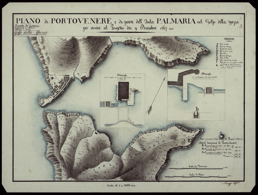 PIANO DEL PORTOVENERE E DI PARTE DELL'ISOLA PALMARIA NEL GOLFO DELLA SPEZIA PER SERVIRE AL PROGETTO DEI 9 DICEMBRE 1817 - DUCATO DI GENOVA DIPARTIMENTO DI MARINA LITTORALE DI DI LEVANTE GOLGO DELLA SPEZIA.