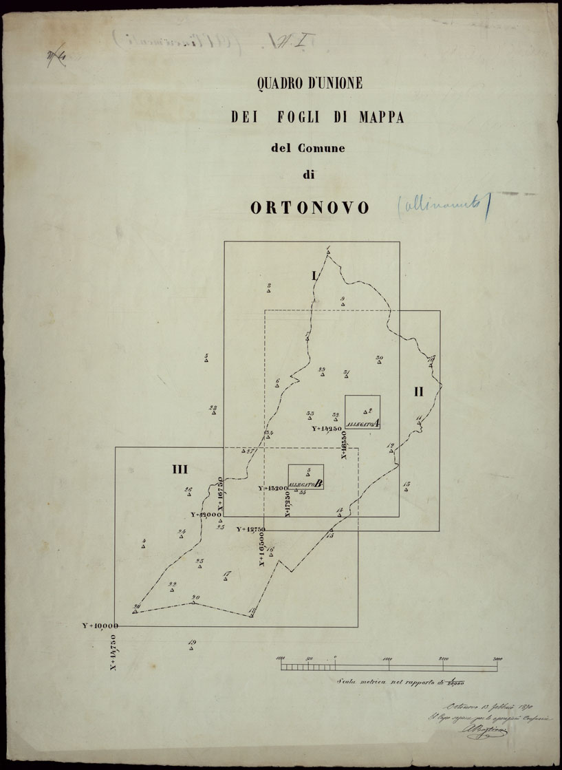 "Rilievo del Comune di Ortonovo eseguito col metodo degli allineamenti. Tre grandi fogli, montati su tela, firmati dagli agenti censuari e vistati dal Capo-sezione A. Boglietti. Vi sono due allegati (A e B) contenenti i rilievi degli abitati di Ortonovo e di Nicola alla scala di 1:500. Annessi un piano delle coordinate rettangolari del Comune di Ortonovo (allineamenti) e due quadri d'unione dei fogli di mappa e dei fogli di tavoletta alla scala di 1:2.000. Con lo stesso numero di Categorico 8918 è archiviato anche "Comune di Ortonovo - rilevamenti parcellari col metodo angolare""