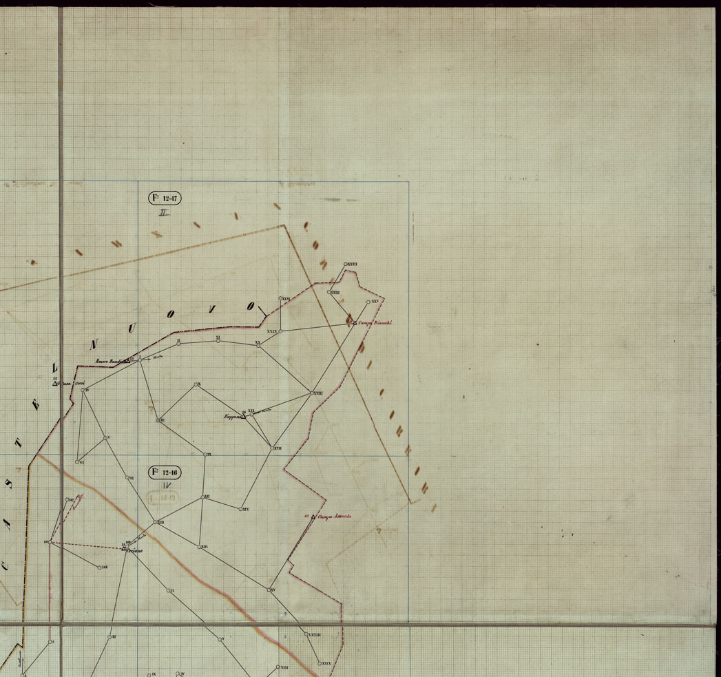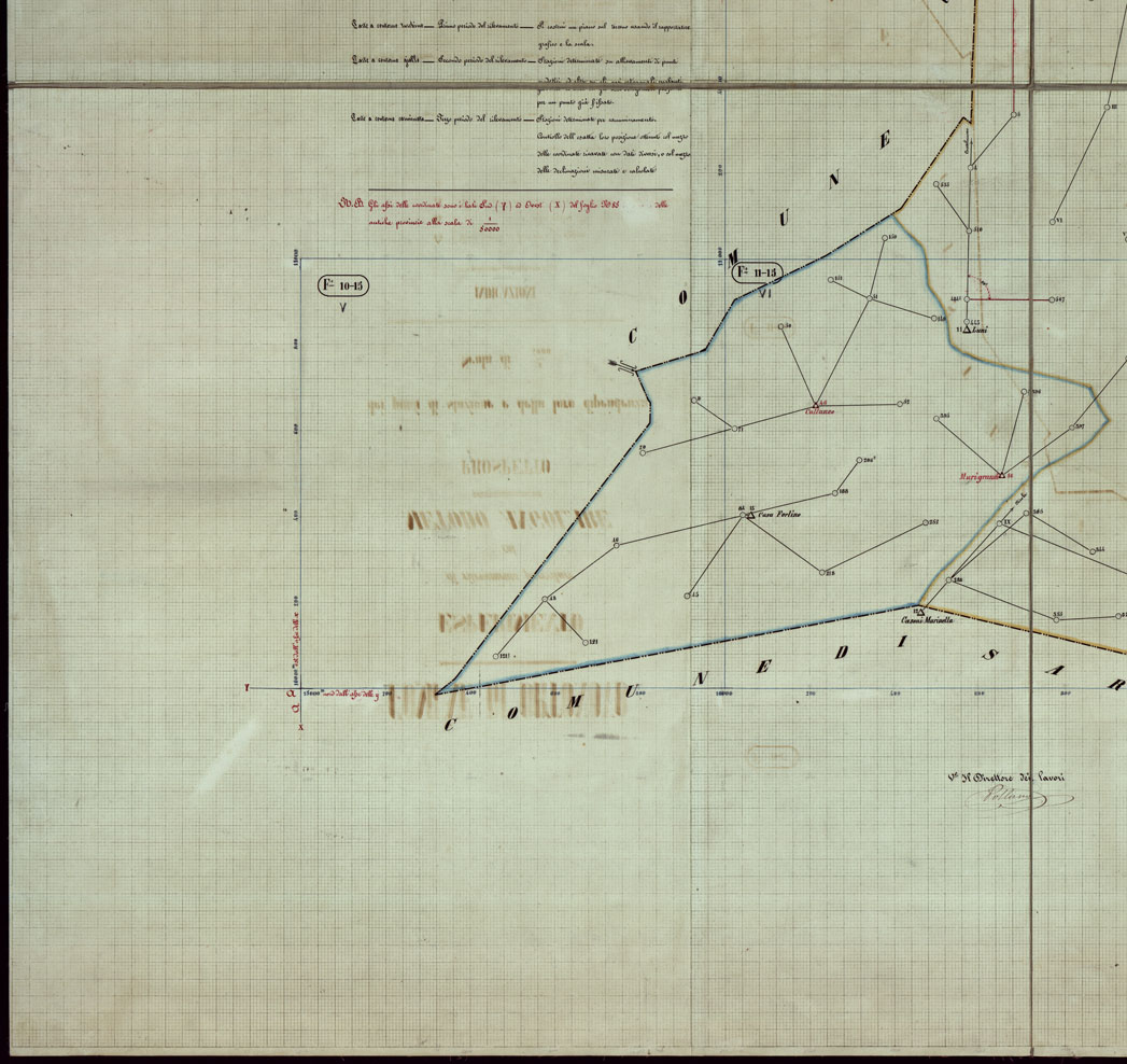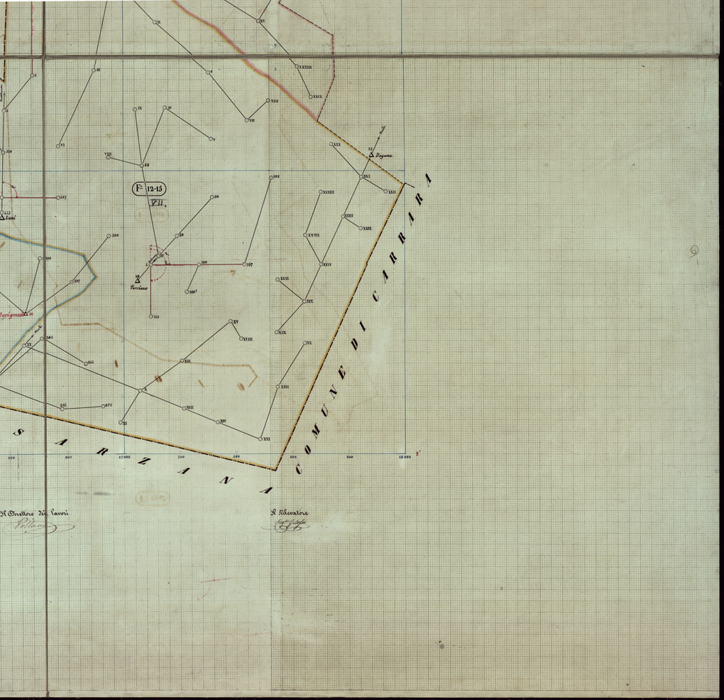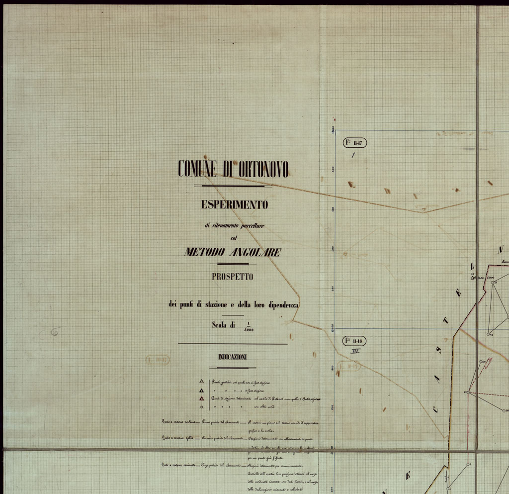 "Esperimento di rilevamento parcellare col metodo angolare. Sette grandi fogli montati su tela, di dimensioni varie, alla scala di 1:1.000, rilevati da G. Rossi, vistati dal direttore dei lavori Pollano. Epoca 1870. Annesso un "prospetto dei punti di stazione e della loro dipendenza" alla scala di 1:4.000. Con lo stesso numero di Categorico 8918 è archiviato anche "Mappa del Comune di Ortonovo". Annessi ai documenti 323, 324, 325, 326, 327/8918 ci sono n° 13 volumi, contenenti quaderni di appunti, schizzi, delimitazioni territoriali, elenchi di coordinate, ecc., relativi alla costruzione delle carte, datati 1869-70. "