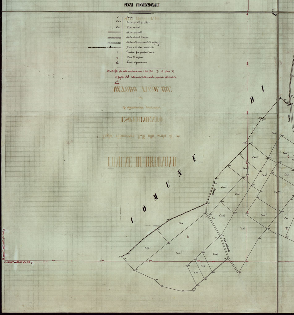 "Esperimento di rilevamento parcellare col metodo angolare. Sette grandi fogli montati su tela, di dimensioni varie, alla scala di 1:1.000, rilevati da G. Rossi, vistati dal direttore dei lavori Pollano. Epoca 1870. Annesso un "prospetto dei punti di stazione e della loro dipendenza" alla scala di 1:4.000. Con lo stesso numero di Categorico 8918 è archiviato anche "Mappa del Comune di Ortonovo". Annessi ai documenti 323, 324, 325, 326, 327/8918 ci sono n° 13 volumi, contenenti quaderni di appunti, schizzi, delimitazioni territoriali, elenchi di coordinate, ecc., relativi alla costruzione delle carte, datati 1869-70."