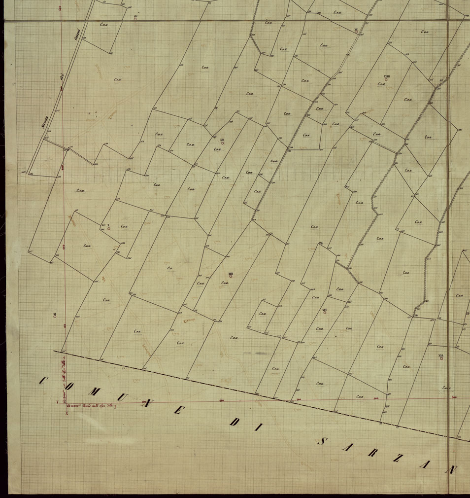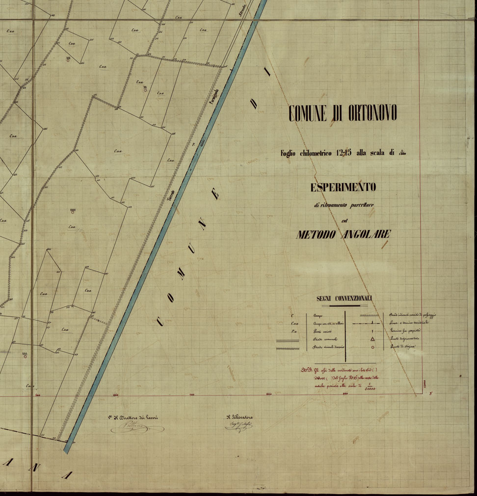 "Esperimento di rilevamento parcellare col metodo angolare. Sette grandi fogli montati su tela, di dimensioni varie, alla scala di 1:1.000, rilevati da G. Rossi, vistati dal direttore dei lavori Pollano. Epoca 1870. Annesso un "prospetto dei punti di stazione e della loro dipendenza" alla scala di 1:4.000. Con lo stesso numero di Documento 8918 è archiviato anche "Mappa del Comune di Ortonovo". Annessi ai documenti 323, 324, 325, 326, 327/8918 ci sono n° 13 volumi, contenenti quaderni di appunti, schizzi, delimitazioni territoriali, elenchi di coordinate, ecc., relativi alla costruzione delle carte, datati 1869-70."