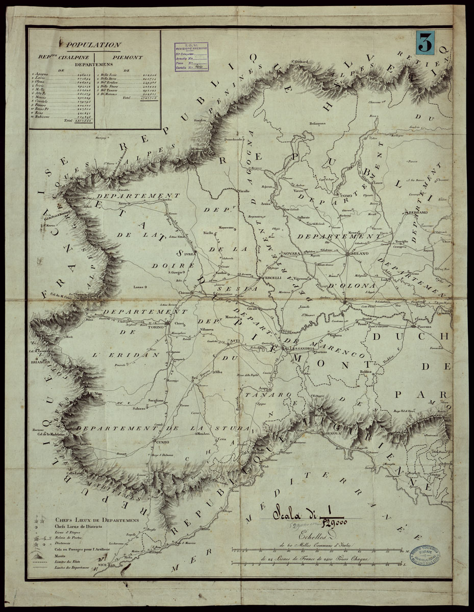 "Riduzione a metà scala della carta d'Italia di Bacler-Dalbe. Una nota sotto il titolo avverte "Cette carte est destinée à tracer les dispositions relatives aux mouvements et aux marches des troupes françaises stationnées dans l'Italie Septentrionale". Rappresenta perciò unicamente i dettagli rispondenti al suo scopo. Schematicamente è tratteggiata la corona delle Alpi al solo scopo di indicarne i colli praticabili. Sul foglio occidentale travansi dati statistici sulla popolazione, la leggenda dei segni convenzionali e le scale grafiche."