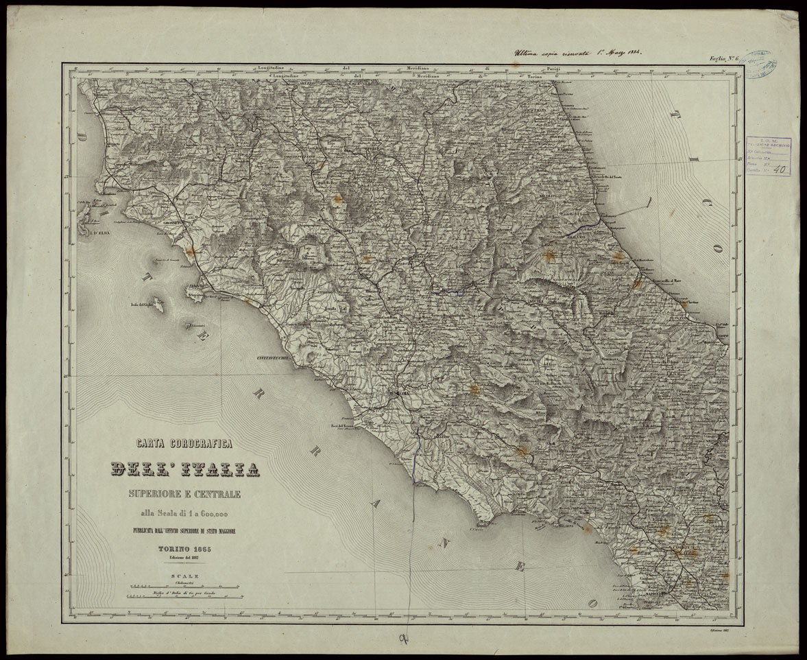 "Subito dopo le prime annesioni del 1859 il Governo sentì il bisogno di avere una carta generale di tutte le provincie dell'alta e media Italia recentemente annesse. Per velocizzare le operazioni si utilizzarono i materiali già esistenti. Perciò presso l'Ufficio Superiore di Stato Maggiore (Torino) vennero completati i quattro rami già esistenti della "Carta Corografica delle Alpi" annessa all'opera: " Le Alpi che cingono l'Italia". Per il quinto foglio si trasse partito della carta dell'Isola di Sardegna del Generale Alberto la marmora. Per il sesto si fece una riduzione della corrispondente parte della carta austriaca dell'Italia centrale alla scala di 1:86.400 e per la parte napoletana di quella del Rizzi Zannoni alla scala di un decimetro per 6 miglia geografiche di 60 al grado. Furono preventivamente introdotte sui rami e nelle riduzioni le principali varianti riscontrate nella topografia e nel sistema stradale ed idrografico dei paesi rappresentati. L'orografia è indicata col tratteggio a luce obliqua. I meridiani tracciati si riferiscono all'Osservatorio di Parigi, ma sui margini dei fogli vi è anche la graduazione che si riferisce all'Osservatorio di Torino. Il campo disegnato è nei primi 4 fogli di m.0,604x0,375 e negli altri è di m.0,604x0,487. I rami incisi, avendo servito alla stampa di centinaia di copie sono ormai logori. A penna il alto è riportato: ultima copia riservata 1 maggio 1884."