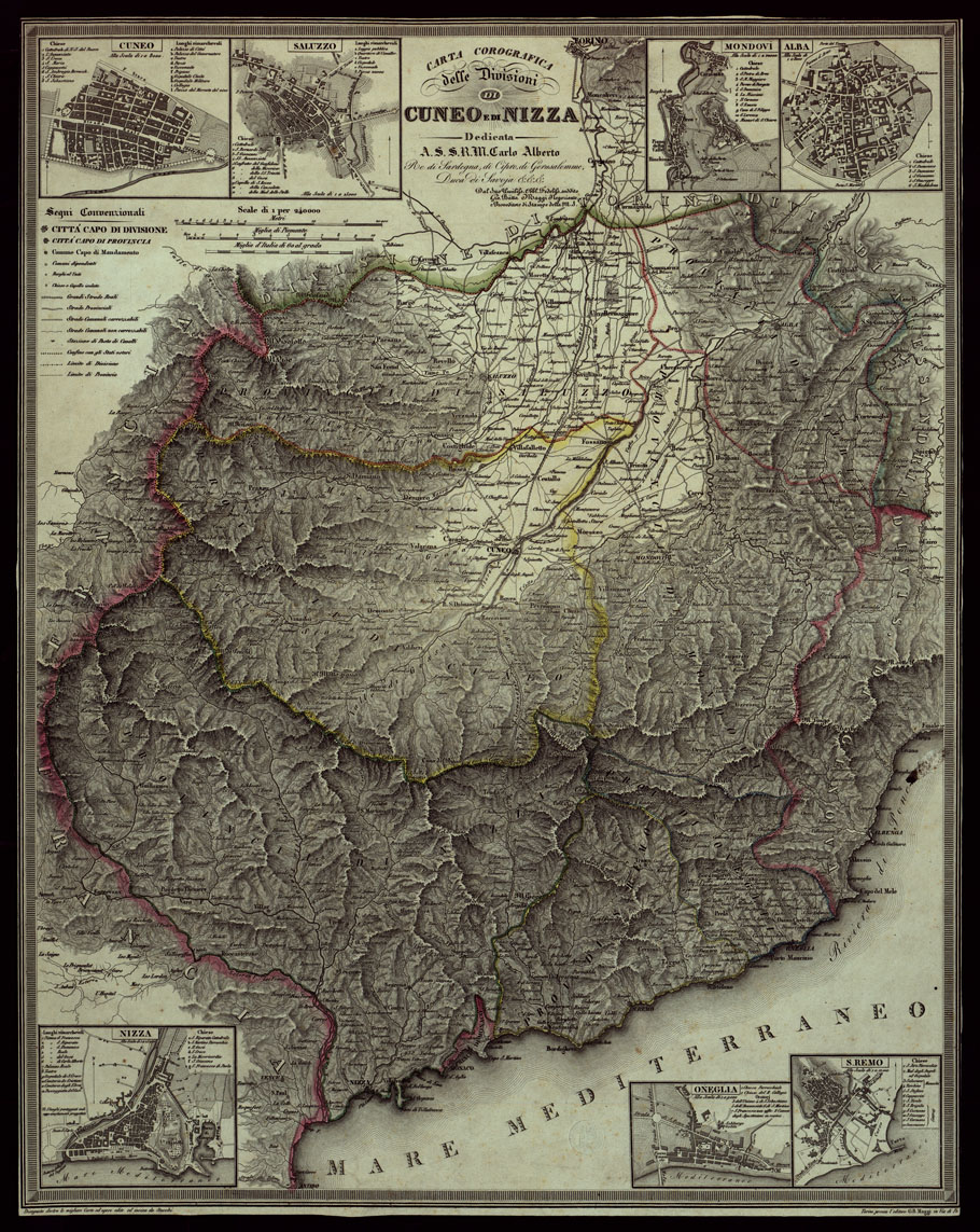 CARTA COREGRAFICA DELLE DIVISIONI DI CUNEO E DI NIZZA DEDICATA A.S.S.R.M. CARLO ALBERTO RE DI SARDEGNA, DI CIPRO, DI GERUSALEMME, DUCA DI SAVOIA, &&& DAL SUO UMILISS. OBBL. FEDELISS. SUDDITO GIO BATTA MAGGI NEGOZIANTE E PROVEDITORE DI STAMPE DELLA M.S.