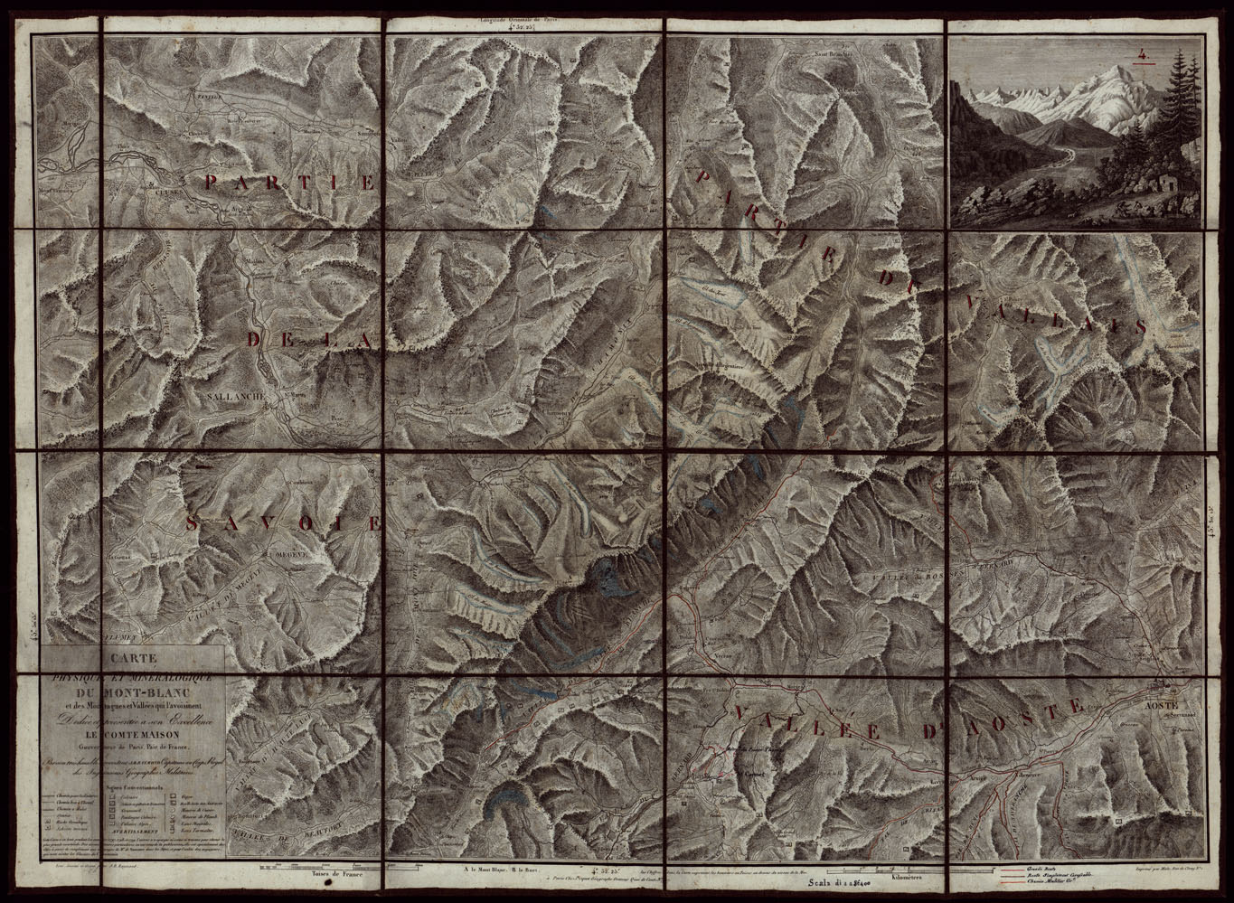 CARTE PHISIQUE ET MINERALOGIQUE DU MONT-BLANC ET DES MONTAGNES ET VALLEES QUI L'AVOISINENT DEDIEE ET PRESENTEE A SON EXELLENCE LE COMTE MAISON GOUVERNEUR DE PARIS PAIR DE FRANCE