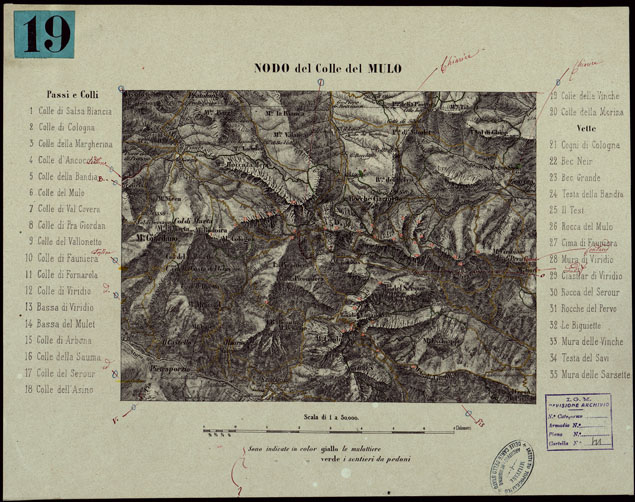 "Un foglio in litografia con rilievo orografico dimostrato a mezzo del tratteggio a luce obliqua mulattiere in giallo, sentieri per pedoni in verde. Ai lati elenco numerico dei Passi e Colli e dell Vette. In basso una nota avverte che le correzioni del terreno e delle strade furono eseguite dal Cap Balduino dell'8° Compagnia Alpina. Il Documento si compone di cinque esemplari afferenti a diverse revisioni."