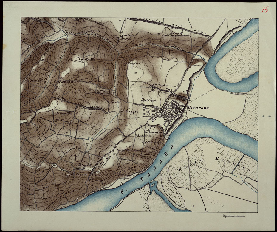 "Il titolo non è presente sulla carta. Carta in sedici fogli montati su carta, stampati in cromolitografia a curve di livello per uso del Giuoco di Guerra."