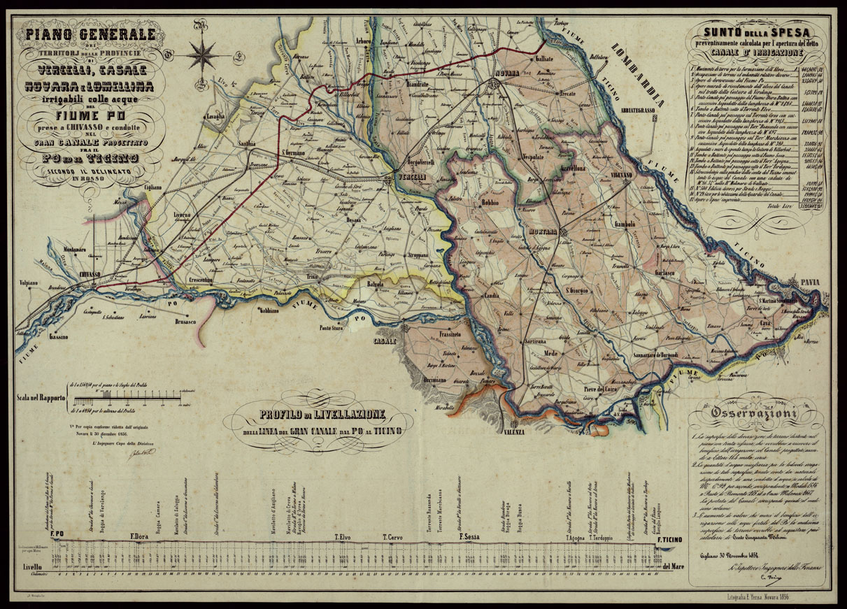 PIANO GENERALE DEI TERRITORI DELLE PROVINCIE DI VERCELLI, CASALE, E LOMELLINA IRRIGABILI COLLE ACQUE DEL FIUME PO', PRESE A CHIVASSO E CONDOTTE NEL GRAN CANALE PROGETTATO FRA IL PO' ED IL TICINO SECONDO IL DELINEATO IN ROSSO.